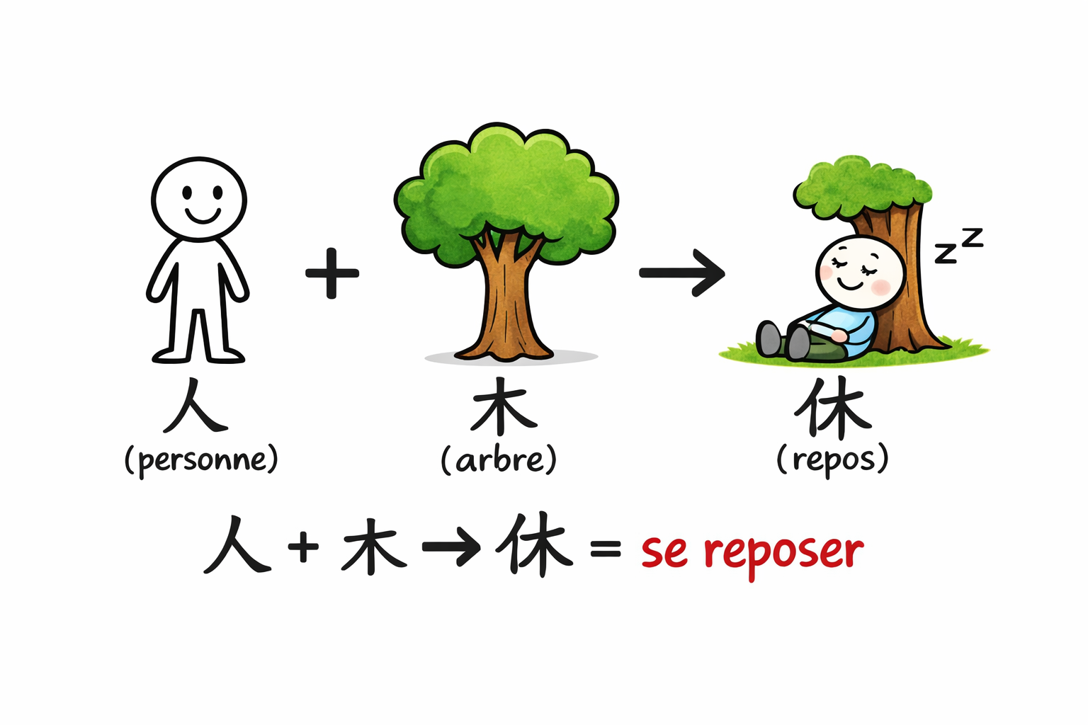 👉 Il est composé de 人 (une personne) et de 木 (un arbre).