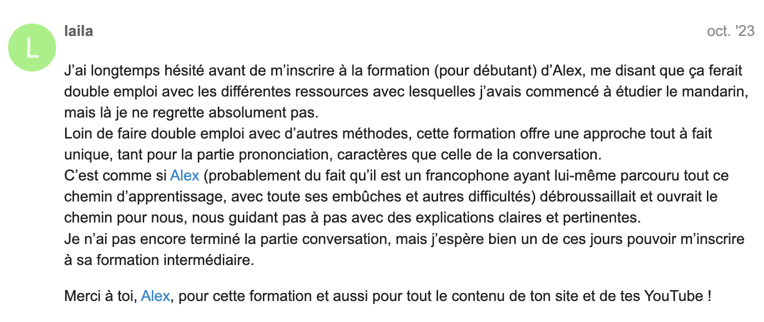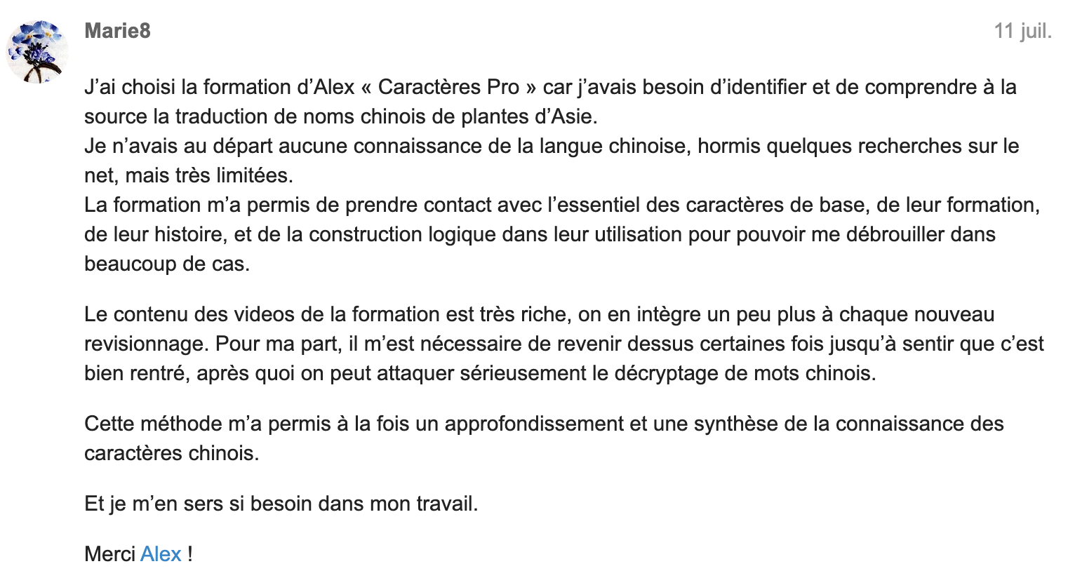 "La formation d’Alex m'a permis d’apprendre et surtout de mémoriser plus facilement les caractères chinois grâce à des petites histoires mnémotechniques bien trouvées."