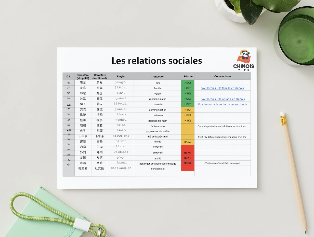 👉Inclus le niveau HSK pour chaque mot afin de t'aider à préparer l'examen.